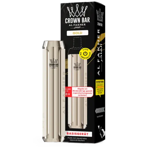 Der Al Fakher Akku-Träger in Gold ist das passende Basisgerät für das Crown-Bar-System. Hochwertig verarbeitet, einfach in der Anwendung und auf den dauerhaften Einsatz ausgelegt. Die edle Gold-Optik sorgt für eine starke Präsentation im Verkauf.