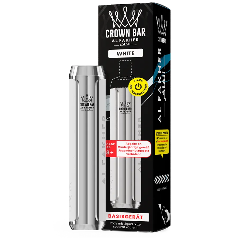 Der Al Fakher Akku-Träger in Weiß ist das passende Basisgerät für das Crown-Bar-System. Unauffällig, hochwertig und alltagstauglich – die neutrale Farbe passt zu jedem Sortiment und spricht eine breite Zielgruppe an.