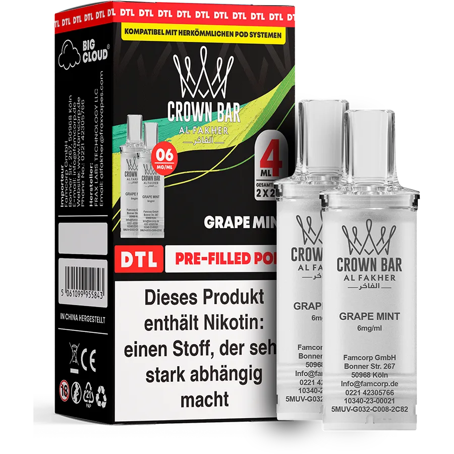 Al Fakher Pods – Grape Mint (2 %) verbinden einen süßen, saftigen Traubengeschmack mit einer milden, frischen Minznote. Das Aroma ist rund, modern und angenehm klar – ideal für Nutzer, die fruchtige Sorten mit leichter Frische lieben, aber keine extremen Ice-Profile mögen.