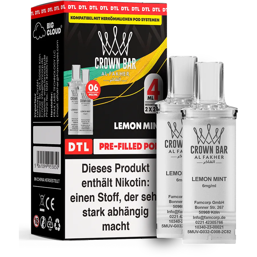 Al Fakher Pods – Lemon Mint (2 %) vereinen die helle, spritzige Note frischer Zitrone mit einer milden Minzfrische. Das Aroma ist leicht, angenehm süß und besonders ausgewogen – ideal für Nutzer, die frische Sorten ohne extremen Ice-Kick bevorzugen.