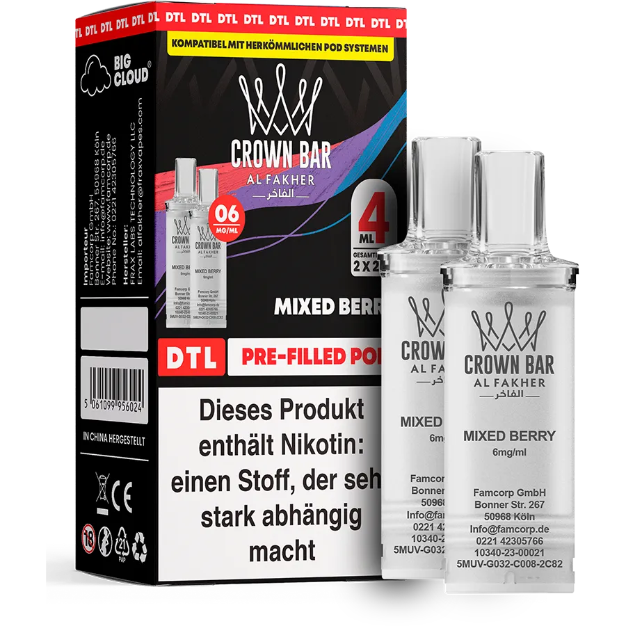 Al Fakher Pods – Mixed Berry (2 %) vereinen eine Auswahl süßer, fruchtiger Beeren in einem harmonischen, klaren Mix. Das Aroma wirkt rund, modern und sofort ansprechend – ideal für Nutzer, die unkomplizierte, fruchtige Sorten suchen.