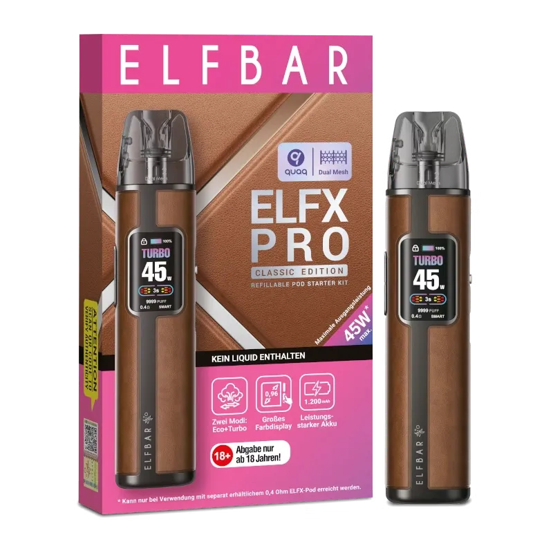 Das ELFBAR ELFX PRO ist ein leistungsstarkes Pod-System für anspruchsvolle Nutzer. Mit bis zu 45 Watt Leistung und moderner Dual-Mesh-Technologie liefert das Gerät ein intensives und gleichmäßiges Dampferlebnis.
