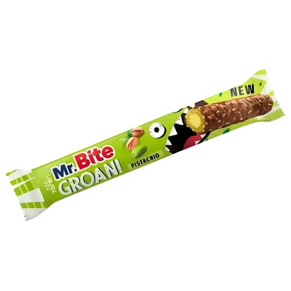 Der MR. Bite Toren Groan Pistazien liefert eine intensive Kombination aus cremiger Pistazienfüllung und vollmundiger Schokolade. Der Riegel ist kompakt, sättigend und spricht besonders Kunden an, die kräftigere Texturen und reichhaltigen Geschmack bevorzugen.