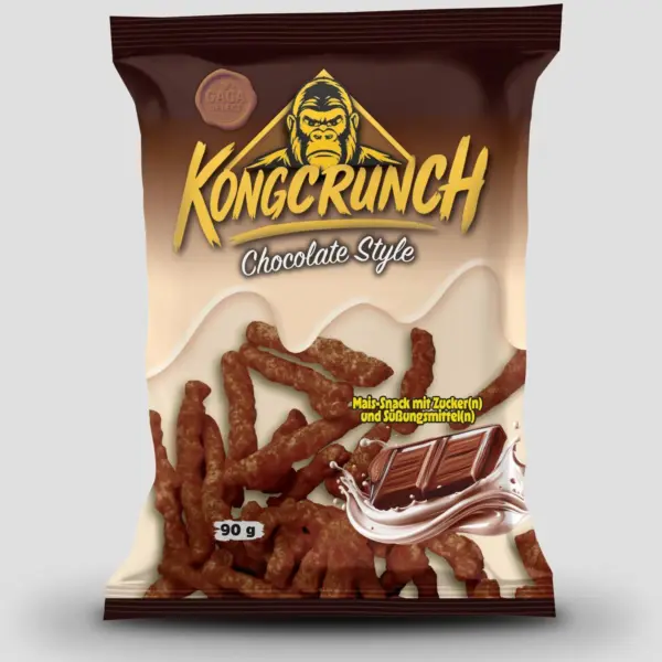 Kongcrunch Chocolate Style kombiniert knusprige Mais-Sticks mit einer schokoladig-süßen Note. Der Snack ist leicht, crunchy und klar auf Genuss ausgelegt – perfekt für den schnellen Griff zwischendurch.